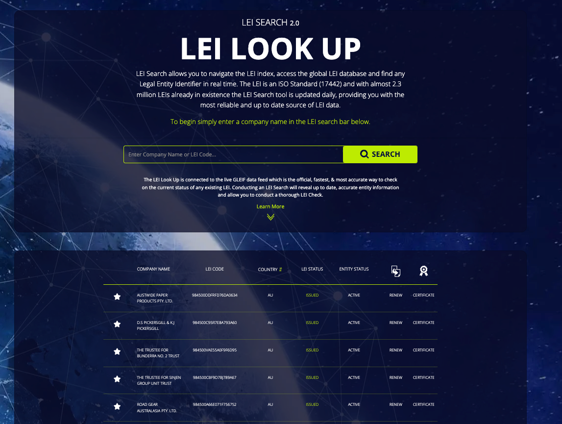 LEI Search allows you to navigate the LEI index, access the global LEI database and find any Legal Entity Identifier in real time.