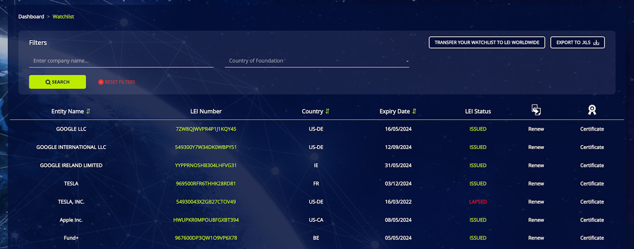 The LEI Watchlist can also be used to track your own group LEIs and ensure they do not expire inadvertently. This does not necessarily mean those LEIs are being managed by LEI Worldwide, they can indeed be with any number of providers, allowing users to consolidate their LEIs into one place.