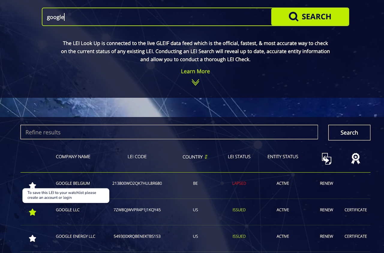 Go to the LEI Search Tool: https://leiworldwide.com/lei_search