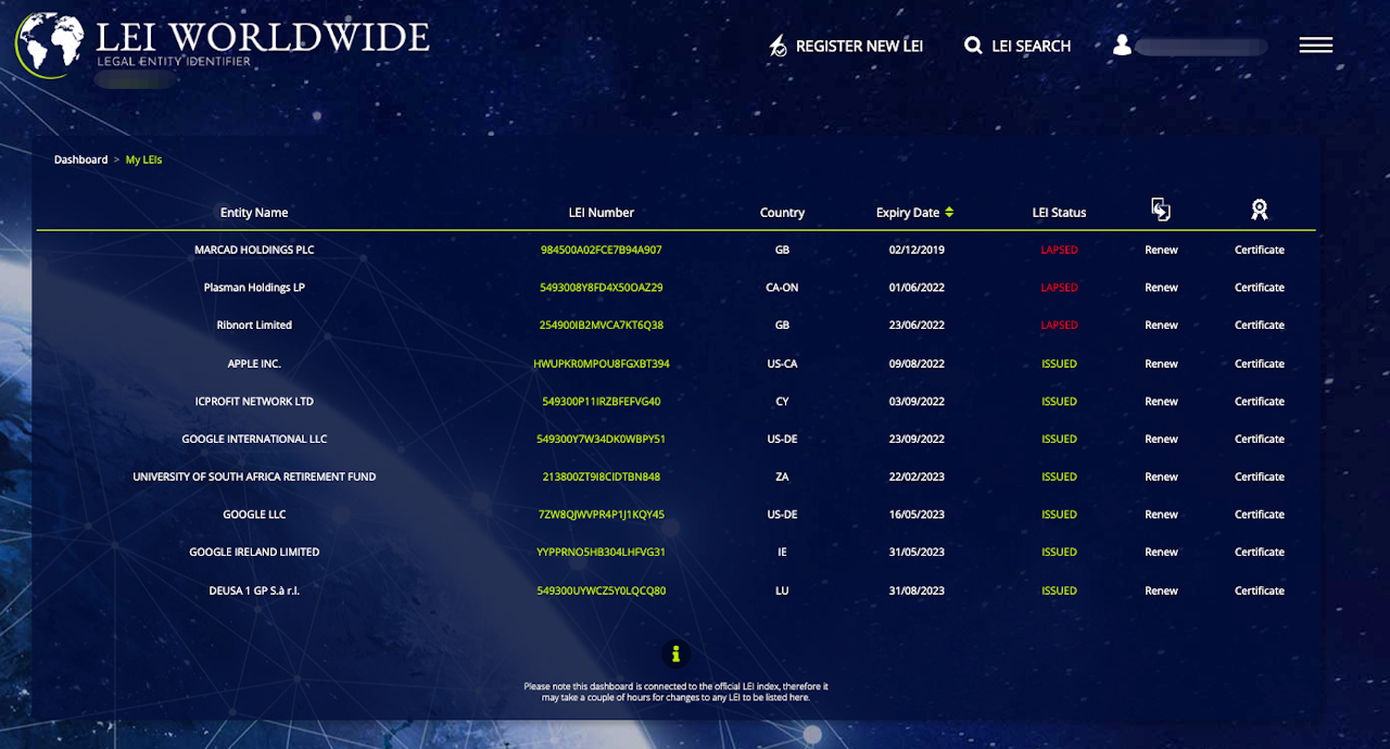 Note: You must be logged into your LEI RAMP account in order to view your My LEIs Dashboard