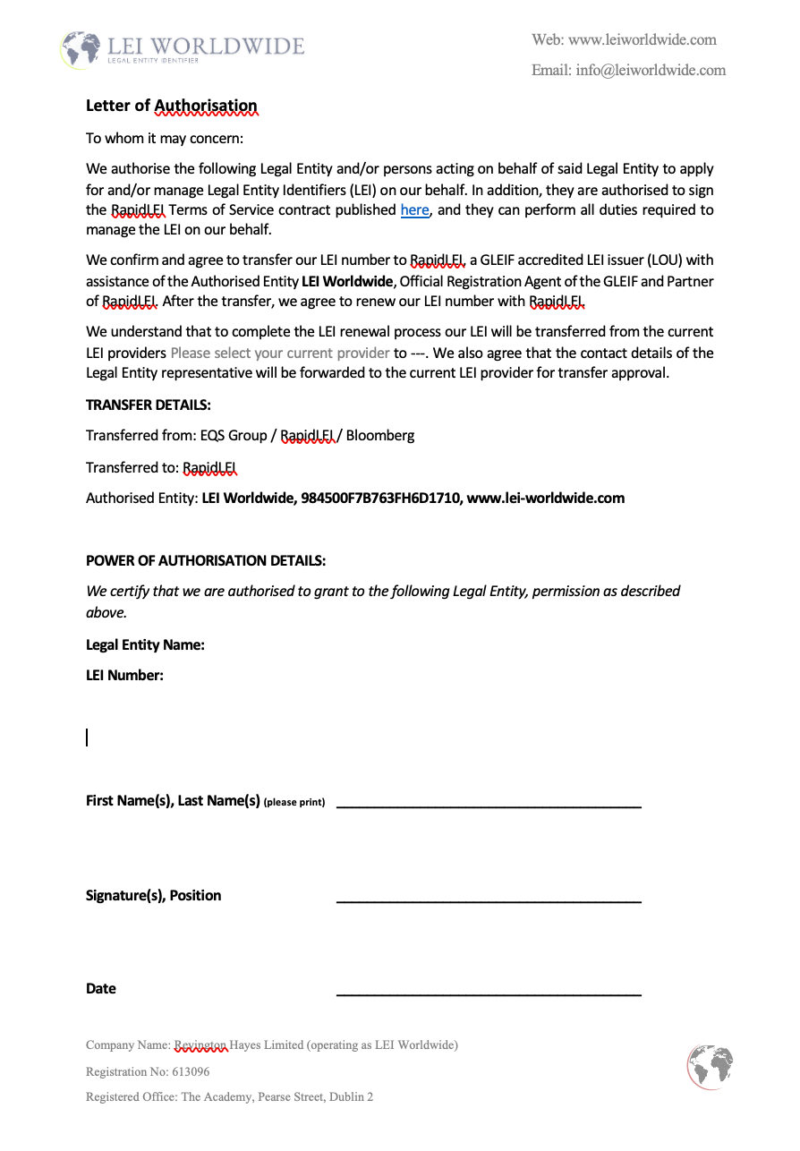 Applying for, renewing and transferring Legal Entity Identifiers is an important step towards obtaining a global identity for your business. On a global level it will mitigate KYC requirements by each entity having a common identifier system. In order to achieve this the LEI issuance process is carefully meticulous. One of the requirements is that the Authorised Signatory of the company approves the LEI application. To do this we use an LOA, or letter of authorisation.